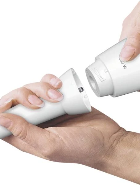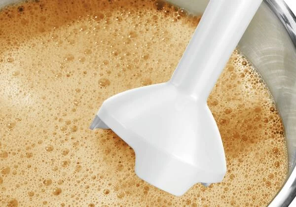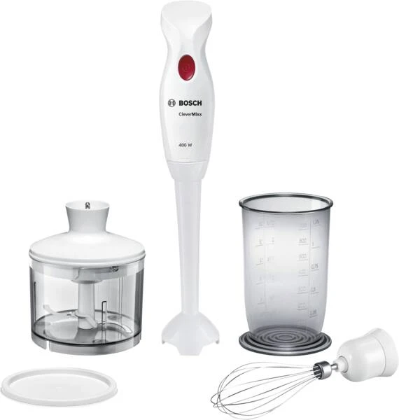 Stabmixer, Kunststofffuß, 400 Watt Leistung, 4-Klingen-Messer, Schneebesen, Edelstahl, Zerkleinerer-Aufsatz, Zubehörteile spülmaschinengeeignet, Mixbecher, 1.250 ml, skaliert
