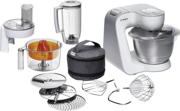 Küchenmaschine, 900 Watt Leistung, Multifunktionsarm, planetarisches Rührsystem, Funktionsstufen: 7, Impuls-/Momentstufe, Edelstahl-Rührschüssel, 3,9 l Fassungsvermögen, Durchlaufschnitzler, 3 Edelstahleinsätze, Knethaken, Mixer-Aufsatz, 1,25 Liter, Kunststoff-Ausführung, Raspel-/Schneidescheibe, Reibscheibe, mittelfein, Rührbesen, Schlagbesen, Zitruspresse, Zubehörteile spülmaschinengeeignet