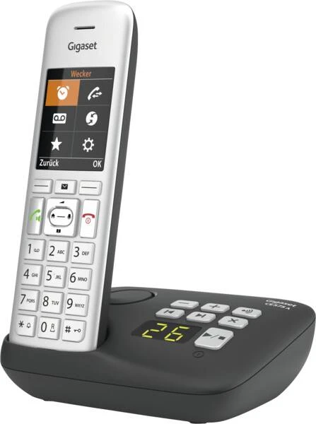 Festnetz-Telefon (für analogen Anschluß), strahlungsarm, schnurlos, integrierter Anrufbeantworter, DECT, GAP-kompatibel, Display 6-zeilig, alphanumerisch, farbig, beleuchtet, Breite x Höhe: 3,5×4,4 cm, 5,8 cm Diagonale, Telefonbuchfunktion, bis 200 Nummernspeicher, Anruferliste, CLIP-Funktion, Direktruf, Freisprecheinrichtung, Großwahltasten, Hörgeräte kompatibel, Anrufersperre, Tastatursperre, ca. 320 Stunden Standby-Zeit