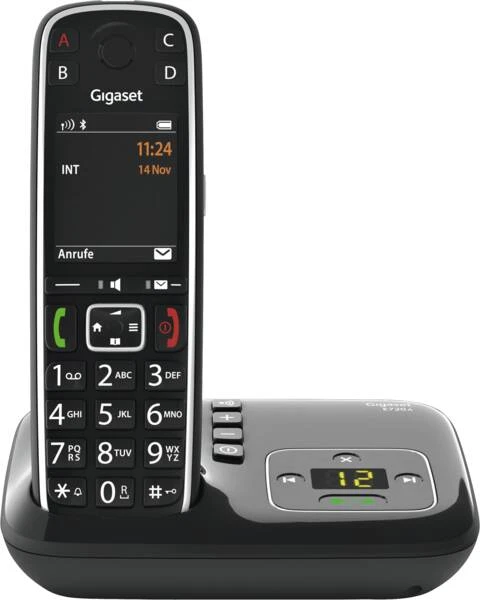 Festnetz-Telefon (für analogen Anschluß), strahlungsarm, schnurlos, integrierter Anrufbeantworter, DECT, GAP-kompatibel, Display 6-zeilig, alphanumerisch, farbig, graphisch, beleuchtet, Breite x Höhe: 3,7×4,7 cm, 5,8 cm Diagonale, Telefonbuchfunktion, bis 200 Nummernspeicher, 4 Direktwahltasten, Anruferliste, CLIP-Funktion, Freisprecheinrichtung, Großwahltasten, Hörgeräte kompatibel, Notruf-Funktion, Raumüberwachung (Babyfon-Funktion ), Zifferntasten mit Sprachansage, Anrufersperre, Tastatursperre, Bluetooth, ca. 300 Stunden Standby-Zeit