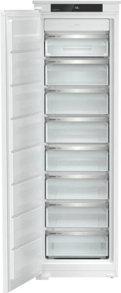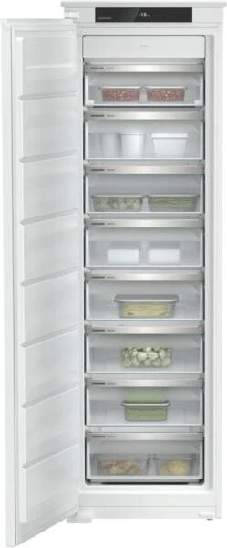 Einbau-Gefrierschrank, Schlepptürmontage, 213 l Rauminhalt, Schubladen: 8, Super-Gefrieren, digitale Temperaturanzeige, NoFrost, Sabbatmodus, VarioSpace (einzelne Gefrierschubfächer herausnehmbar, für extra hohen Stauraum), SmartDevice fähig (Steuerung über Internetverbindung mit optional erhältlicher SmartDeviceBox möglich), per App unterstützter Datentransfer, per App steuerbar, Energieeffizienzklasse F, Breite: 54,1 cm, Höhe: 177 cm, Tiefe: 54,5 cm