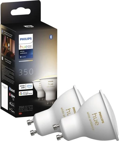 LED-Standardlampe, Energieeffizienzklasse G, 5 Watt, 230 Volt, 350 Lumen Lichtstrom, Sockel GU10, dimmbar, Lichtfarbe Warmweiss/Neutralweiss/Tageslicht (wechselbar), 15.000 Stunden mittlere Nennlebensdauer, Dim to warm [Farbtemperatur-Veränderung] von 2.200bis 6.500 K, Bluetooth, per App steuerbar, integrierte Sprachsteuerung, kompatibel mit Amazon Alexa, Apple HomeKit, Google Assistant, Microsoft Cortana, Android, iOS, Anschluß über die Hue Bridge vorausgesetzt, Höhe: 5,8 cm, 5 cm Durchmesser