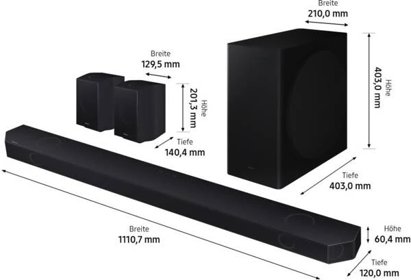 Soundbar, 9.1.4 Kanal-System, Q-Symphony für die perfekte Abstimmung von TV und Soundbar (gleichzeitige Soundwiedergabe über TV und Soundbar), 540 Watt maximale Gesamtleistung, 17 Lautsprecherchassis integriert, Center-Lautsprecher, separater Subwoofer, aktiv, drahtlos, 160 Watt maximale Subwoofer-Leistung, Surround-Lautsprecher drahtlos, Game Mode Pro, High Dynamic Range (HDR 10+), 4K Ultra HD Passthrough (Weiterleitung), Nachtmodus, Spotify Connect, Dolby Atmos, Dolby Digital Plus, Dolby TrueHD, DTS:X, Hi-Res Audio, SpaceFit Sound Pro, per App steuerbar, integrierte Sprachsteuerung, kompatibel mit Amazon Alexa, Smart Things, AirPlay 2, Bluetooth-Schnittstelle, Wireless Lan, HDMI-Eingänge: 1, HDMI-Ausgänge: 1, eARC (enhanced Audio Return Channel), Fernbedienung, Wandhalterung