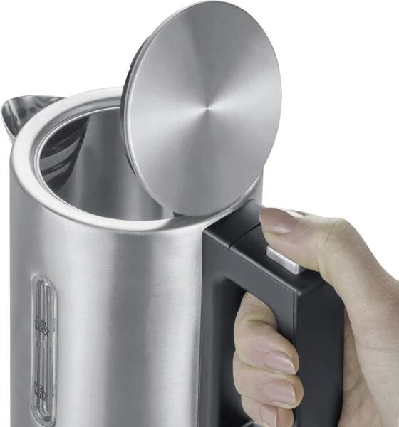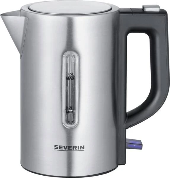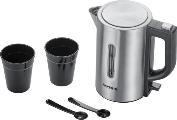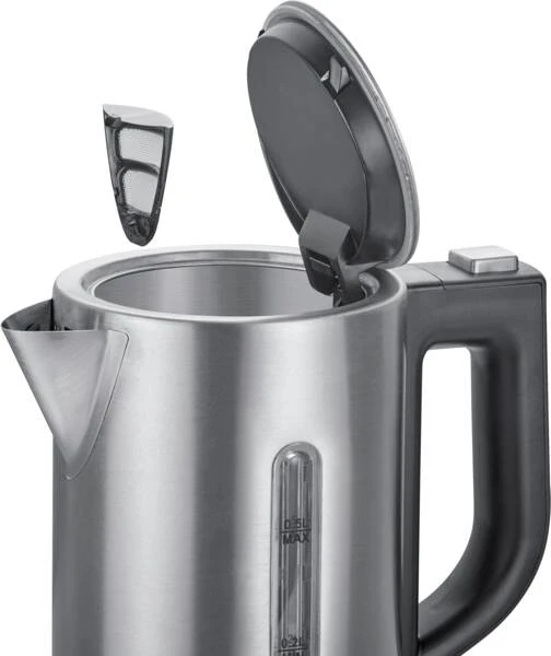 Reise-Wasserkocher, Edelstahl-Ausführung, 0,5 l Fassungsvermögen, 1.100 Watt, verdecktes Heizelement, Deckelöffnung per Knopfdruck, Wasserstandsanzeige, Kalkfilter, herausnehmbar