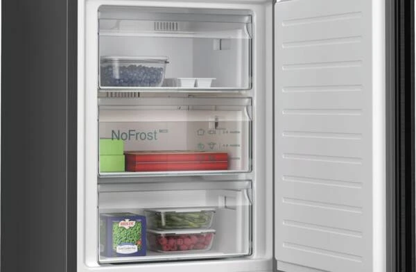 Kühl-/Gefrierkombination, Rauminhalt Kühlen: 260 l, Flaschenablage (liegend), Frische-Behälter: 1, Glasablageflächen: 5, Obst-/Gemüsebehälter: 1, LED-Beleuchtung, Rauminhalt Gefrieren: 103 l, Schubladen: 3, NoFrost, Kühl-/Gefrierteil getrennt regelbar, Energieeffizienzklasse A, Breite: 60 cm, Höhe: 203 cm, Tiefe: 66,5 cm