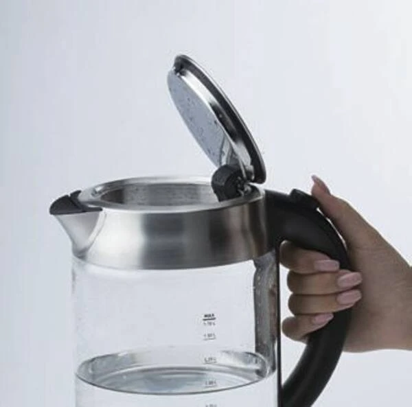 Wasserkocher, Glas-Ausführung, schnurlos, 1,7 l Fassungsvermögen, 2.200 Watt, 360 Grad Anschluß-Sockel, verdecktes Heizelement, Deckelöffnung per Knopfdruck, Innenbeleuchtung, Wasserstandsanzeige, Ein-/Ausschalter, beleuchtet